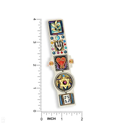 A compact and rich Mezuzah with a strong, hand-crafted feel to it. The work is colorful and bright with a large heart at the center. It is made by hand painting, followed by a variety of materials meticulously arranged inside the delicately cut stainless steel frame to form this beautifully finished Mezuzah case.